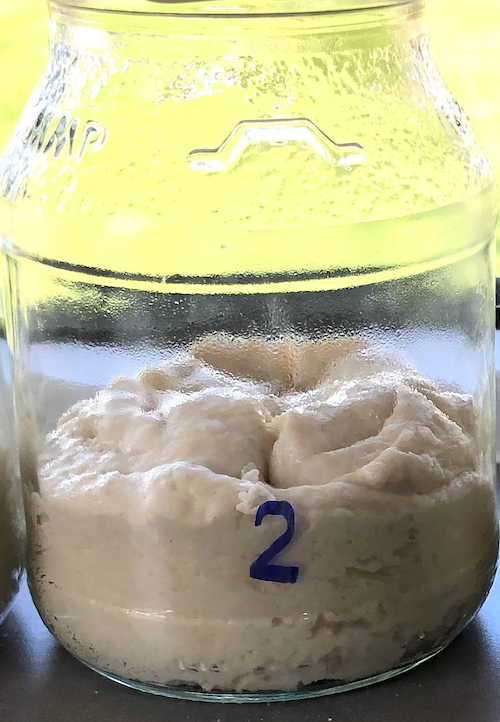 Ein Sauerteig besteht im Grunde aus nur zwei Zutaten: Mehl und Wasser. Mit der Zeit versäuert das Mehl, weil Mikroorganismen (Milchsäurebakterien und Hefen) aus der Luft und der Umgebung die im Mehl enthaltenen Stärken und Zucker zersetzen. Durch diesen Prozess, den man Fermentation nennt, entstehen Milchsäure, Essigsäure und Kohlendioxid. Fertig ist der Sauerteig!